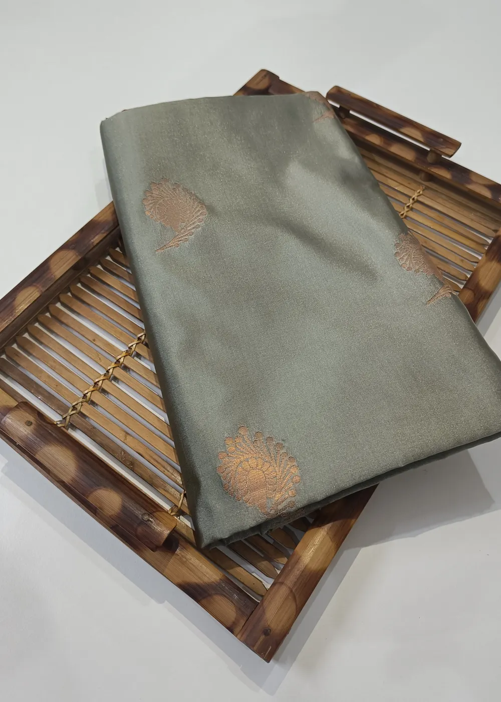 Cloudy grey vegan silk elegantly complemented by a striking peacock inspired border.