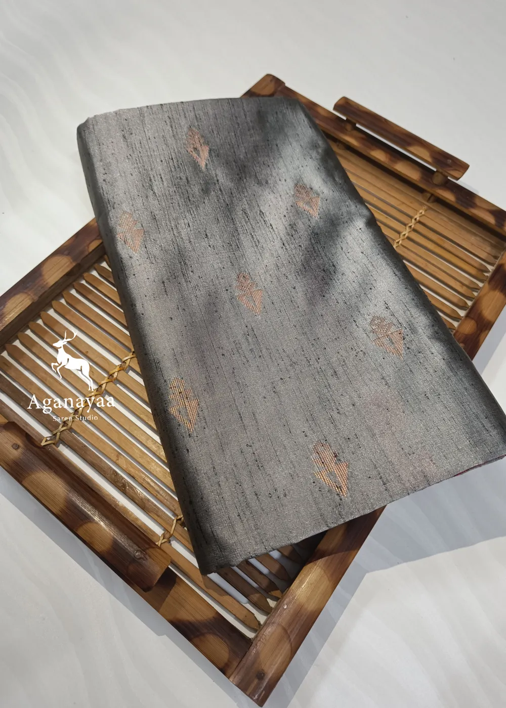 Elevate Your wardrobe with this exquisite Cloudy Grey raw silk saree and the lustrous fabric offers a graceful drape