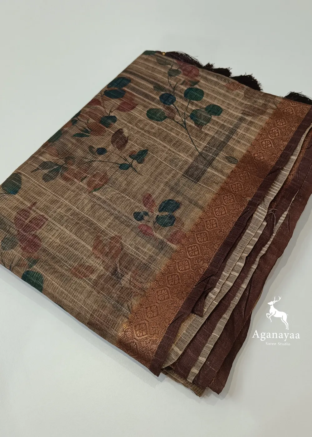 Experience our coffee brown soft texture semi tussar saree enhanced by a rich tiny zari border and has elegant blouse.