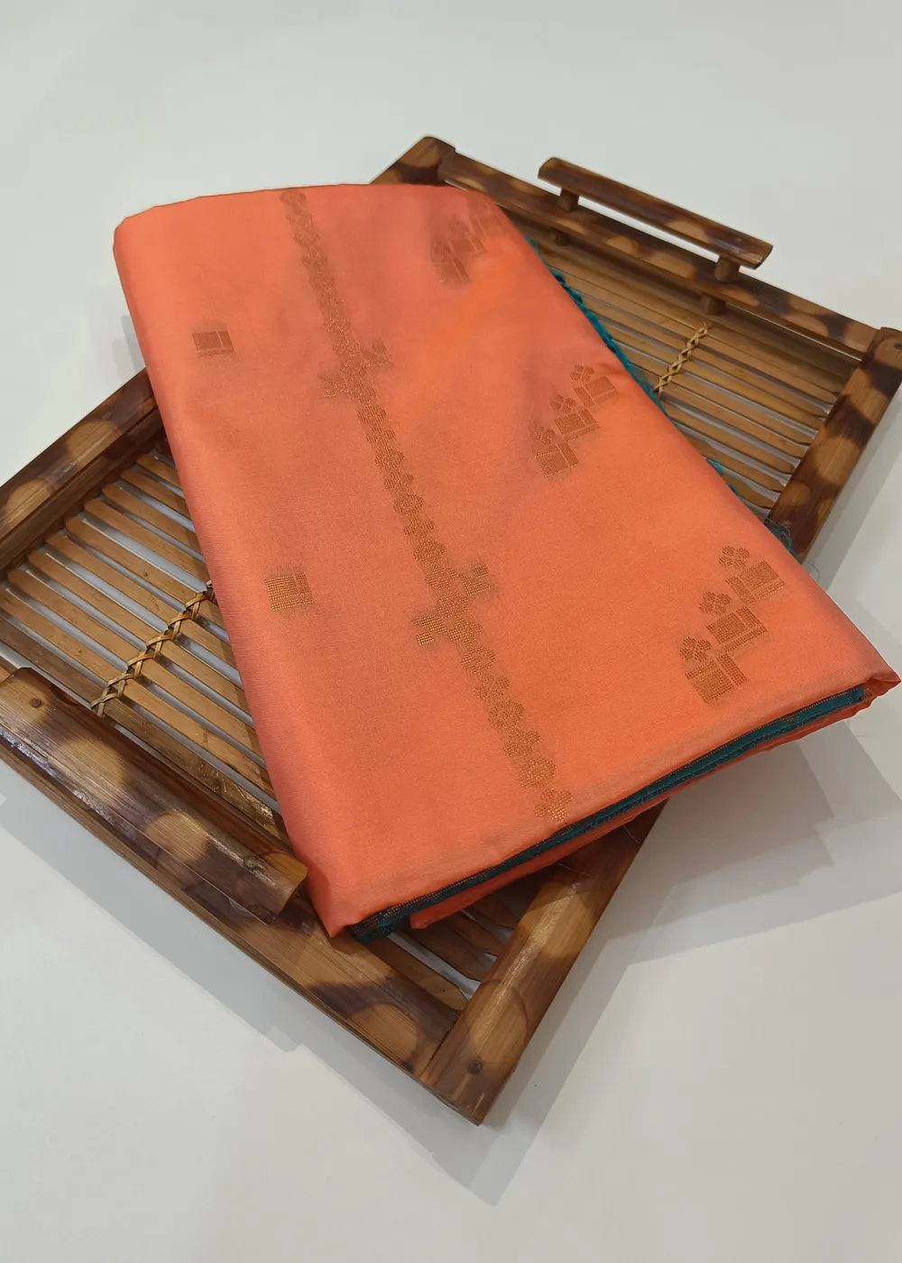 Our Creamy peach vegan silk has small checked butties and linear zari lines all over the saree