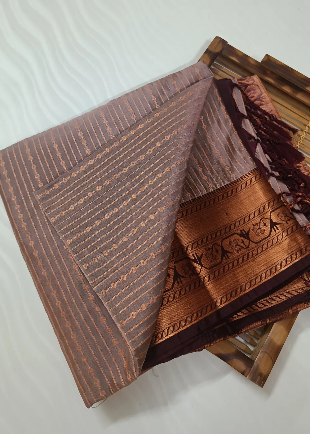 Dusty Rose Vairaoosi Vegan Silk Saree With Intricate Border in Coffee Brown