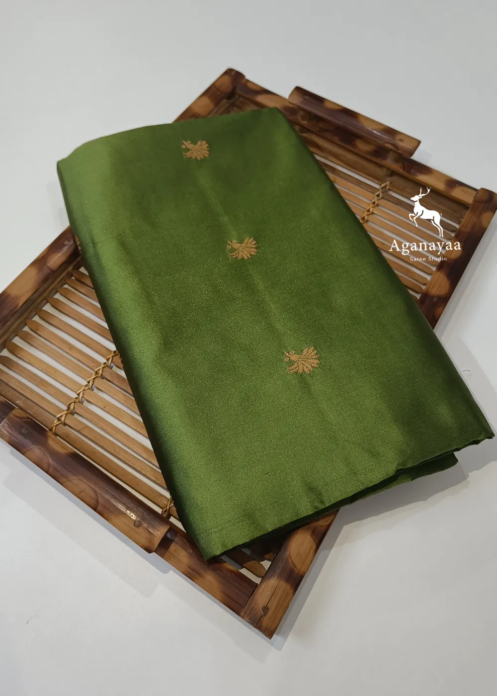This exquisite fern green vegan silk features delicate paisley buttas with unique sparkling border, which truly makes authentic.