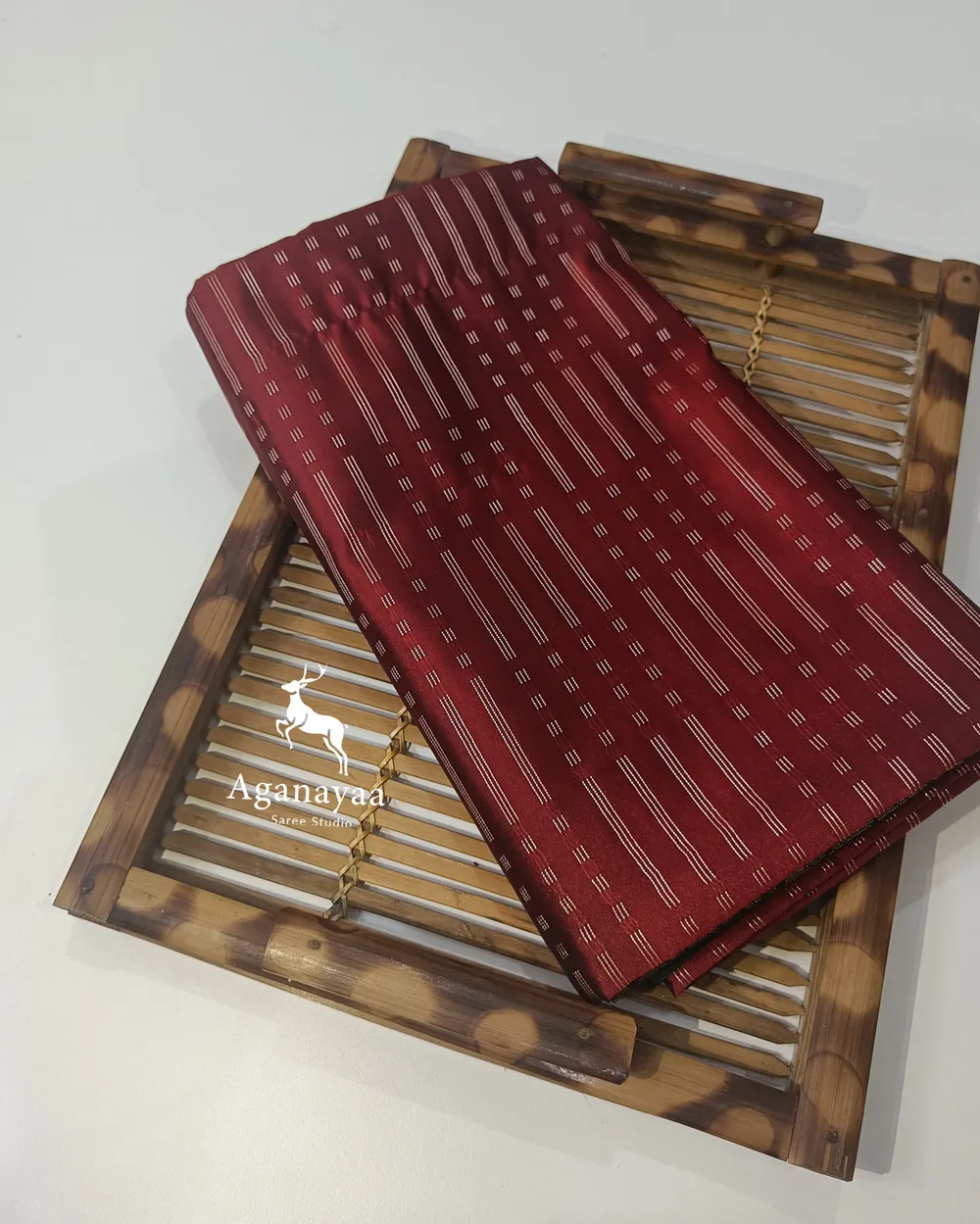 Glossy Maroon traditional vegan silk saree has subtle vertical lines and dark green pallu gives a touch of richness