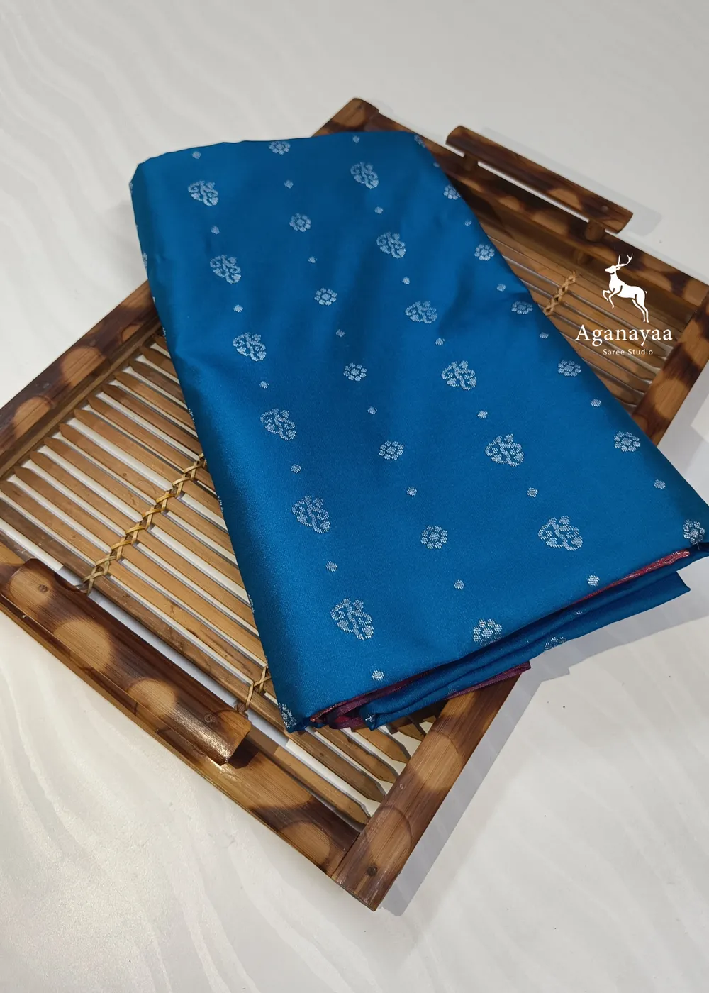 M S Blue 1000 Buttas in flower drop with elegant border and Grand pallu