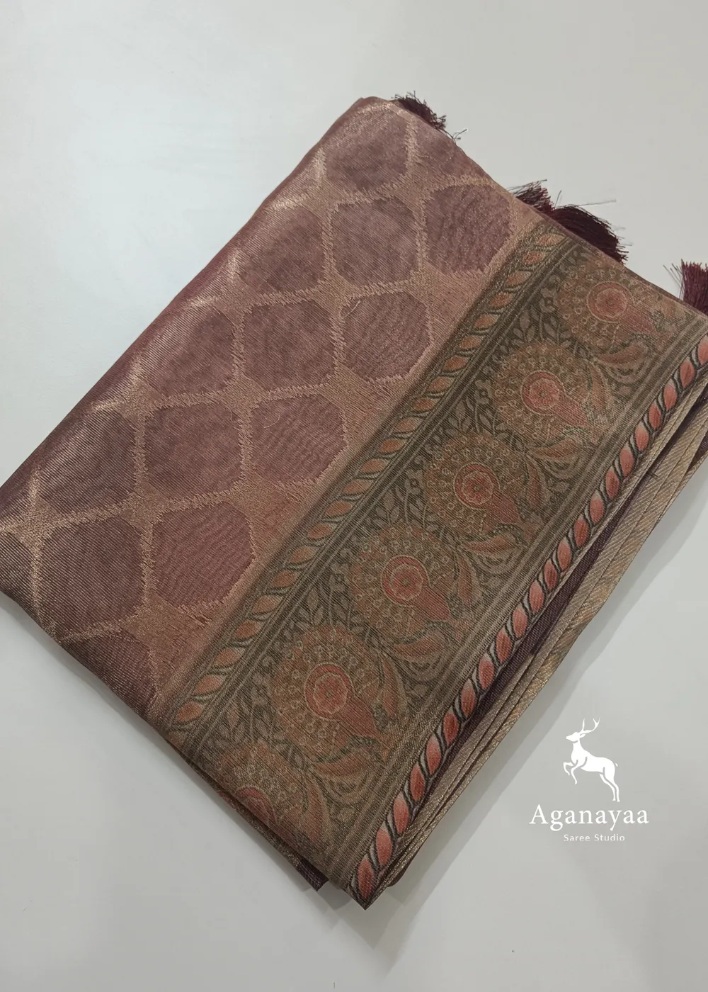 Peach Organza saree drapes beautifully offering a subtle sheen look.