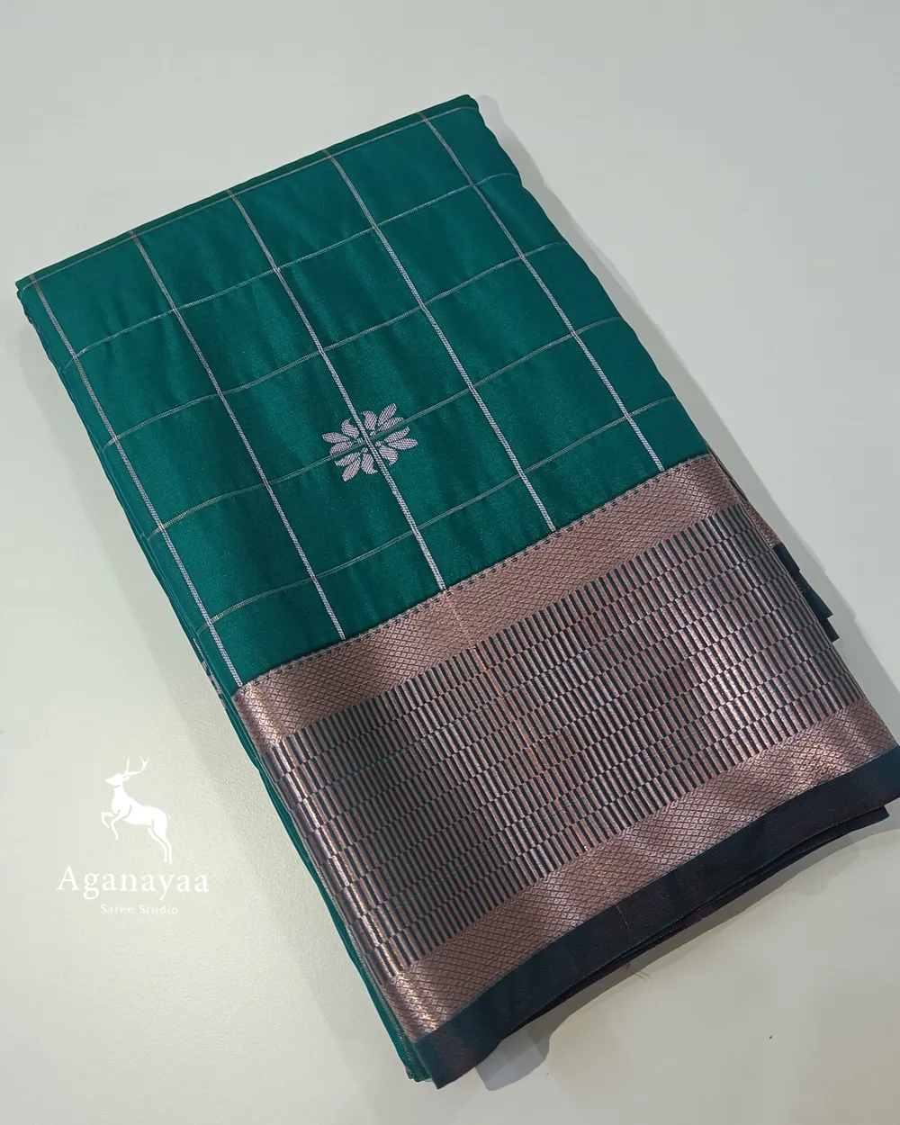 The persian green classic check soft silk saree with its lightweight fabric and has rich zari pallu.