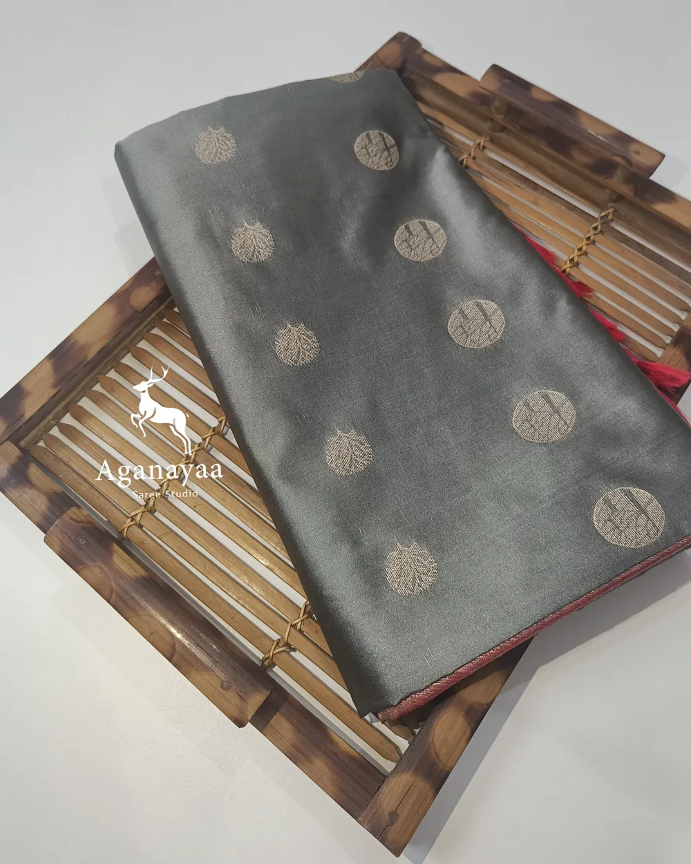 Silver Grey vegan silk saree looks stunning with its enchanted forest theme border in maroon combination