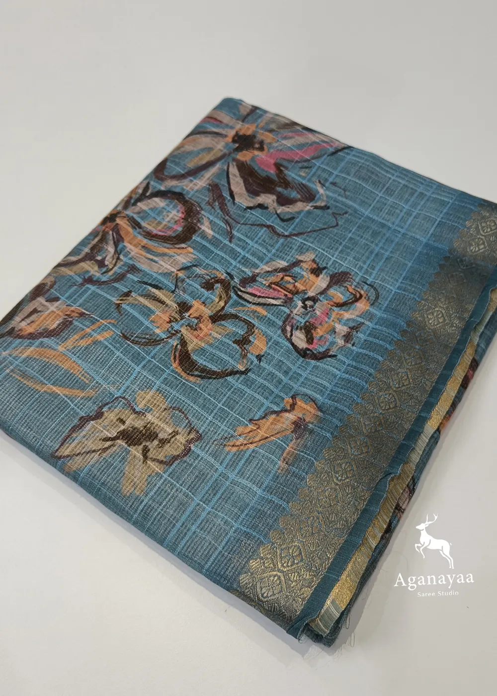 Experience our sky blue soft texture semi tussar saree enhanced by a rich tiny zari border and has elegant blouse.